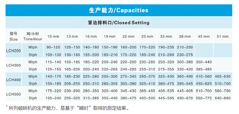 生產(chǎn)能力表可作為L(zhǎng)CH 圓錐破碎機(jī)初步選型的工具,表中數(shù)據(jù)適用于松散密度1.6t/m3 的給料、給料中篩出小于排礦口粒級(jí)、開路作業(yè)條件下的生產(chǎn)能力。在給料中細(xì)粒級(jí)含量較高、閉路作業(yè)條件下,設(shè)備能力比開路作業(yè)高15%- 30%。破碎機(jī)作為生產(chǎn)回路中的一個(gè)重要組成部分,其性能的發(fā)揮部分取決于給料機(jī)、皮帶機(jī)、振動(dòng)篩、支撐結(jié)構(gòu)、電動(dòng)機(jī)、傳動(dòng)裝置及料倉(cāng)等輔件的正確選擇和操作。